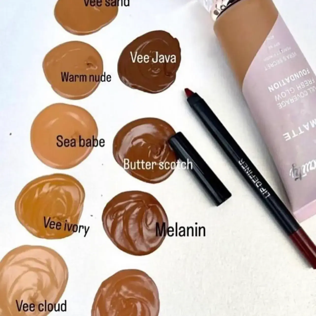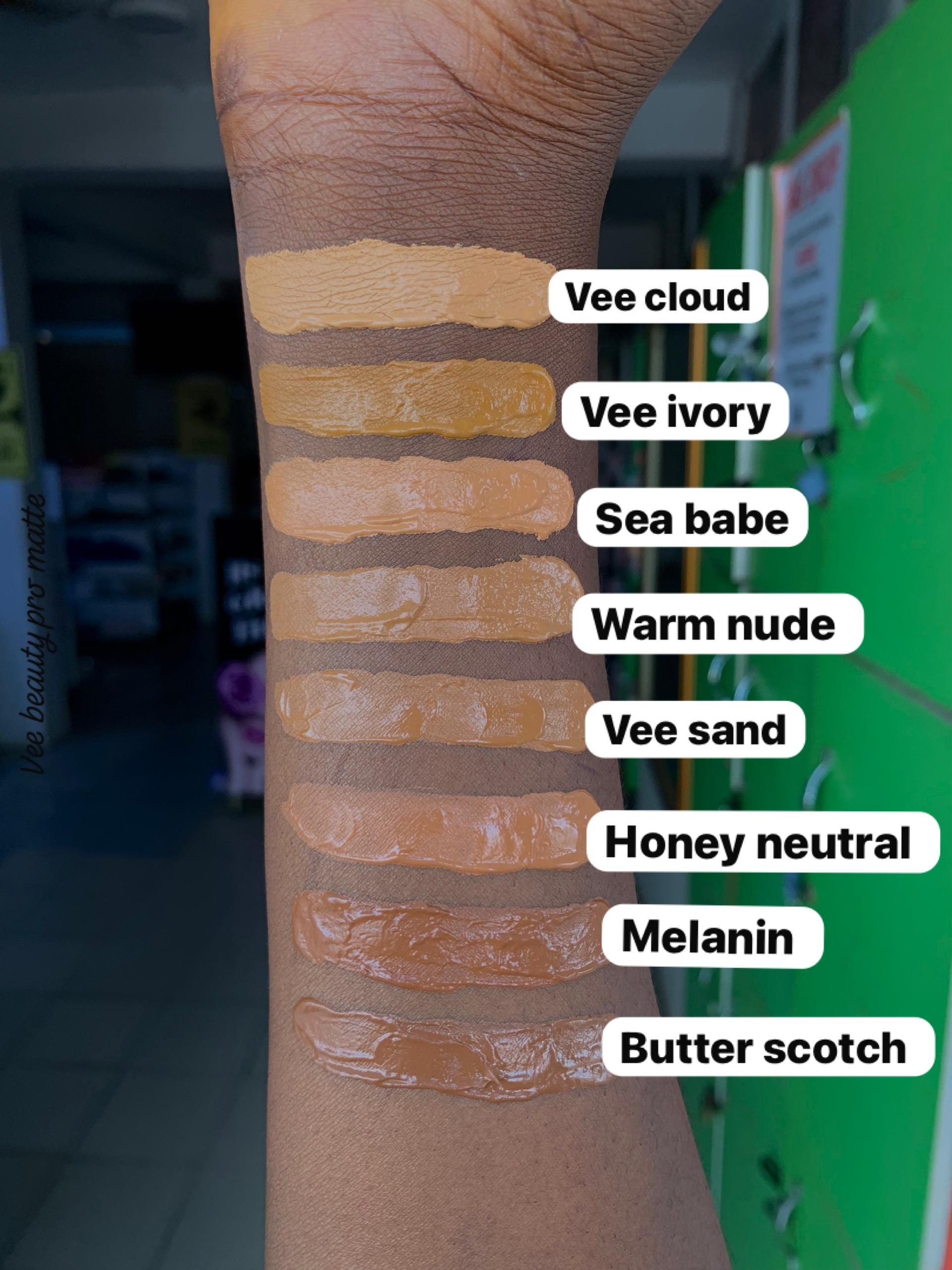 | Color | BUTTERSCOTCH, HONEY NEUTRAL, MELANIN, SEA BABE, VEE CLOUD, VEE IVORY, VEE JAVA, VEE SAND, WARM NUDE |